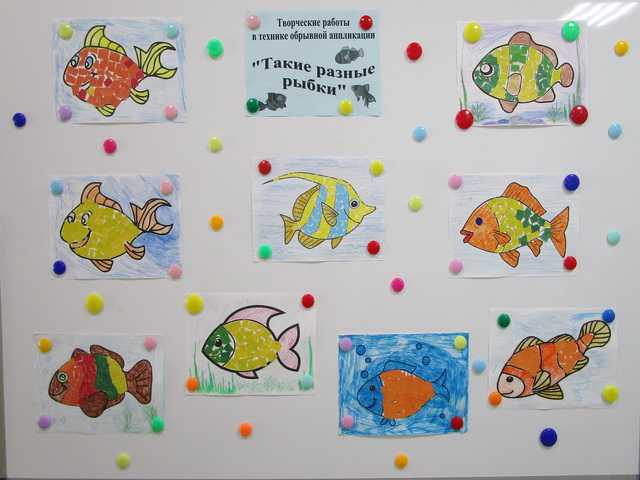Обрывная аппликация – это отличный способ развить мелкую моторику и художественное восприятие. Некоторые элементы рисунка было предложено раскрасить цветными карандашами или фломастерами. В итоге получилось целое море разноцветных рыбок.